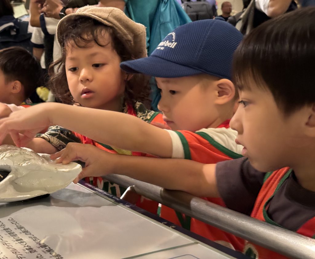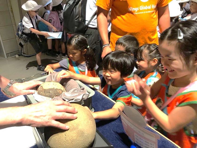 Wings の遠足では、5人の生徒と1人の先生がグループになって展示を回ります。先生と子どもたち、子どもたち同士でたくさんコミュニケーションを取り、これまでに覚えた恐竜の名前を一緒に思い出したり、恐竜の大きさに驚きの声を上げたりしていました。