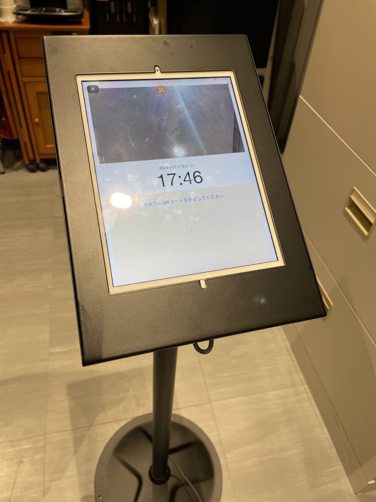 各スクールの入口付近に上画像のi-padが置いてありますので、入退室時にi-pad上部のカメラにQRコードを読み込ませてください。