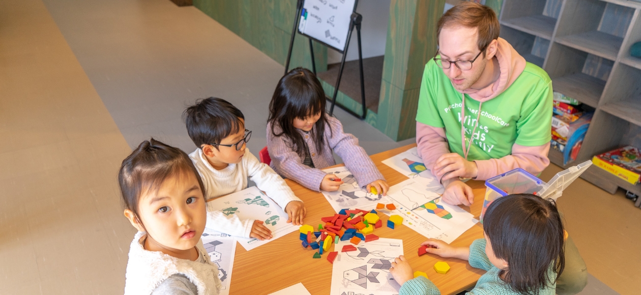 Wings Global Homeでは、2~3才でも文字教育を取り入れており、プリスクールのサークルタイムは、英語の4技能習得の「初めの一歩」となります。 アルファベット、フォニックスの習得度、スペリングができる単語数をカウントし、今後の展望と併せて保護者にお伝えしています。 文字を取り込むことで質の高い英語教育となり、その後のリーディング力を押し上げます。●グループ