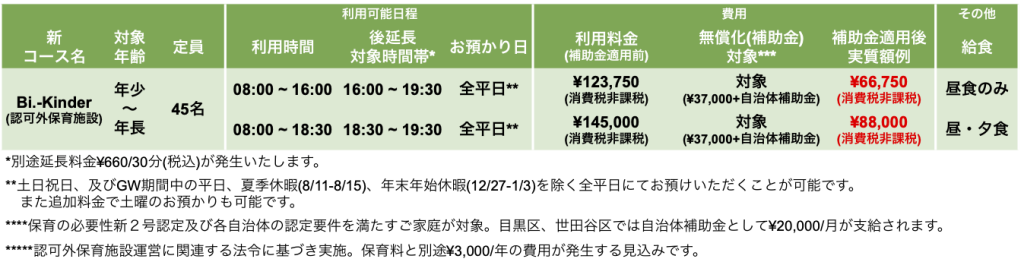 認可外保育施設認定に伴い、今後保育施設としてよりご利用しやすい様、「Bi.-Kinderコース」を新設しました!