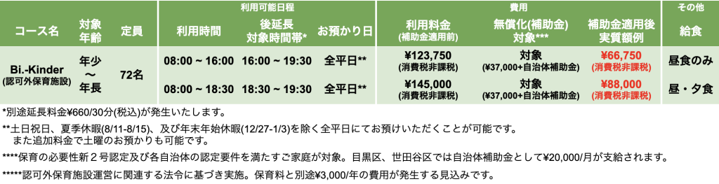 こちらのコースを選択して登園されるお子様は無償化の補助金、1月あたり¥37,000+α*が支給され、また消費税非課税となります。